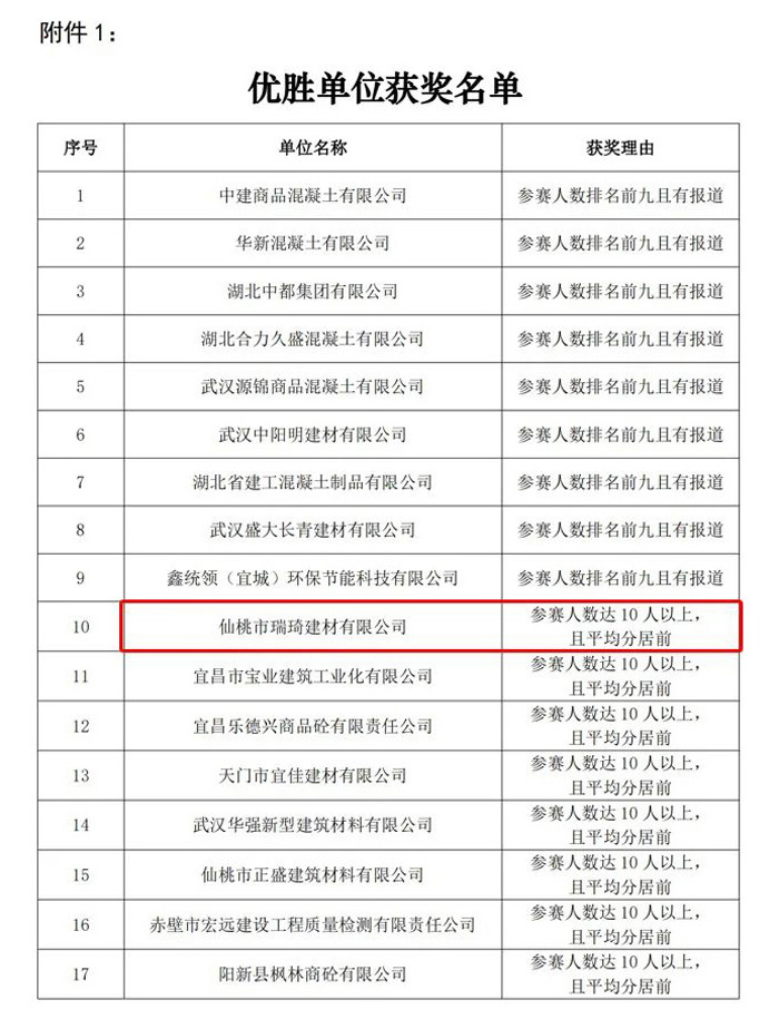 喜訊|瑞琦建材榮獲湖北省預拌混凝土(砂漿)企業(yè)質量管理知識競賽“優(yōu)勝單位”